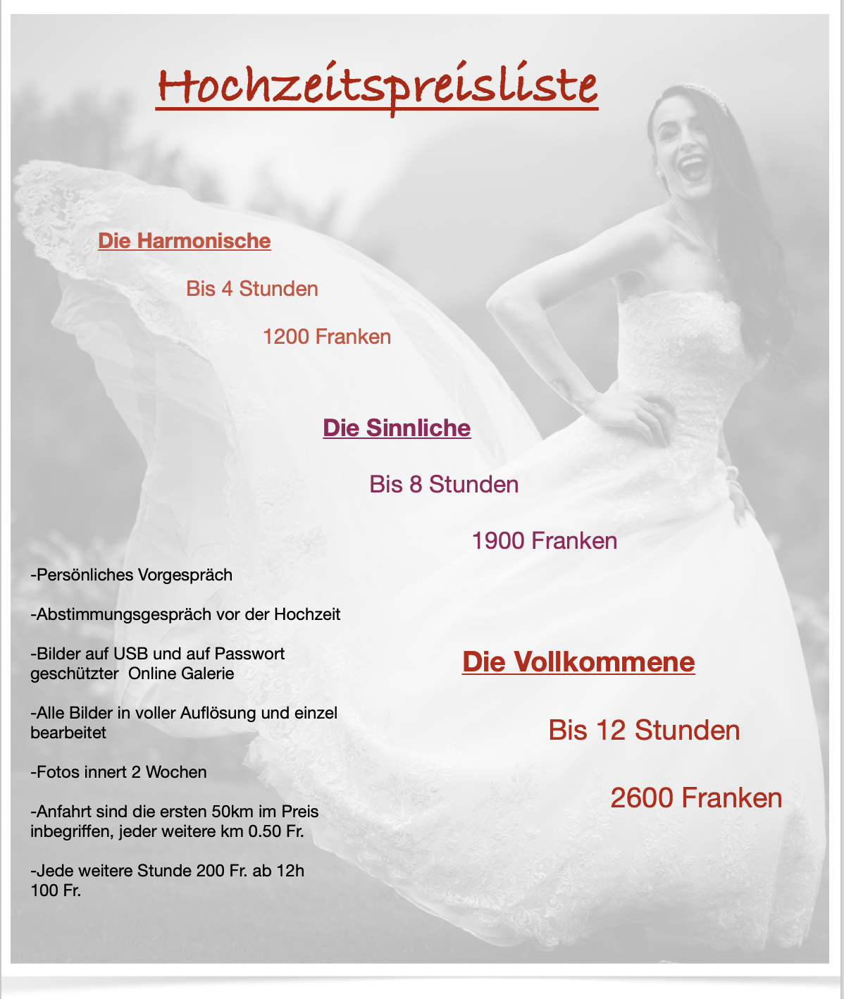 Nachdem ich all eure Wünsche und Vorstellungen bei einem Vorgespräch erfahren habe, begleite ich eure Hochzeitsgesellschaft am Anlass diskret und unauffällig. So könnt ihr euren schönsten Tag in vollen Zügen geniessen.